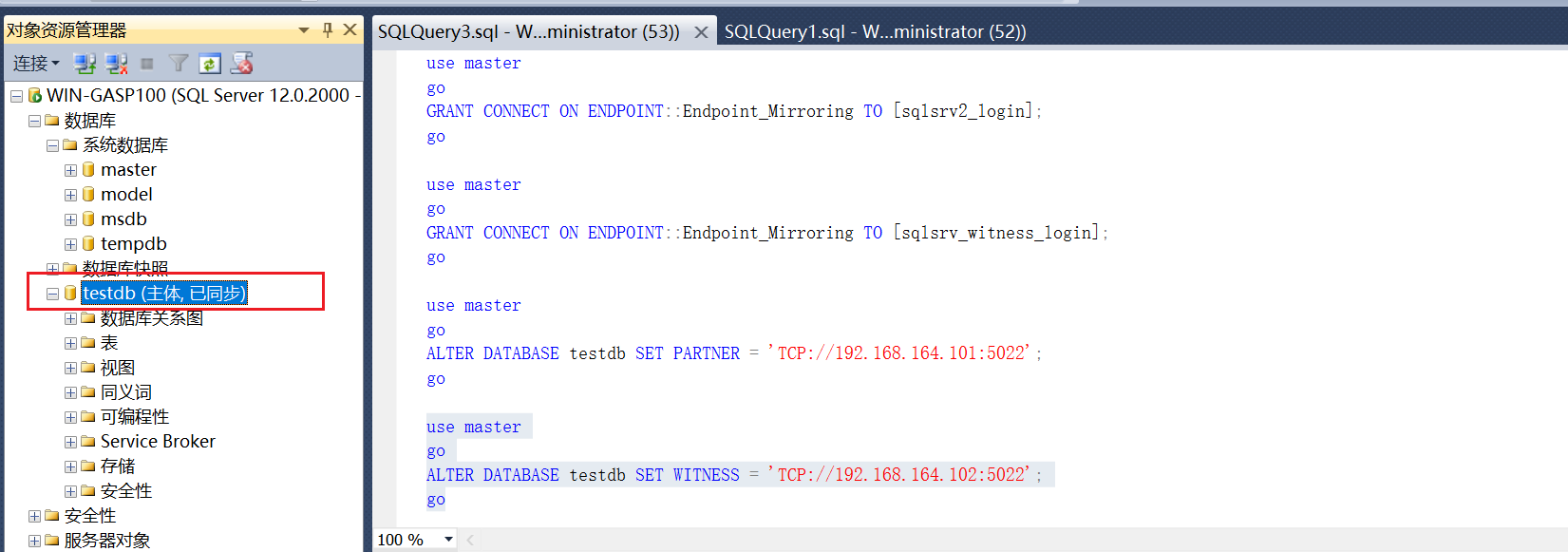 ALTER DATABASE testdb SET PARTNER = 'TCP://192.168.164.100:5022';