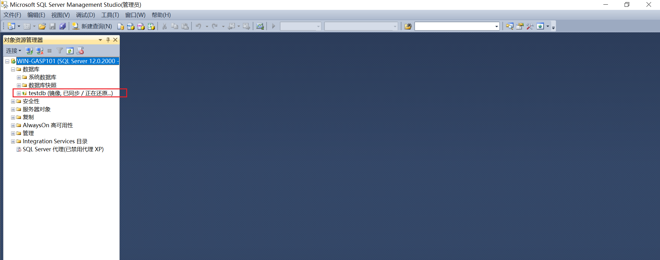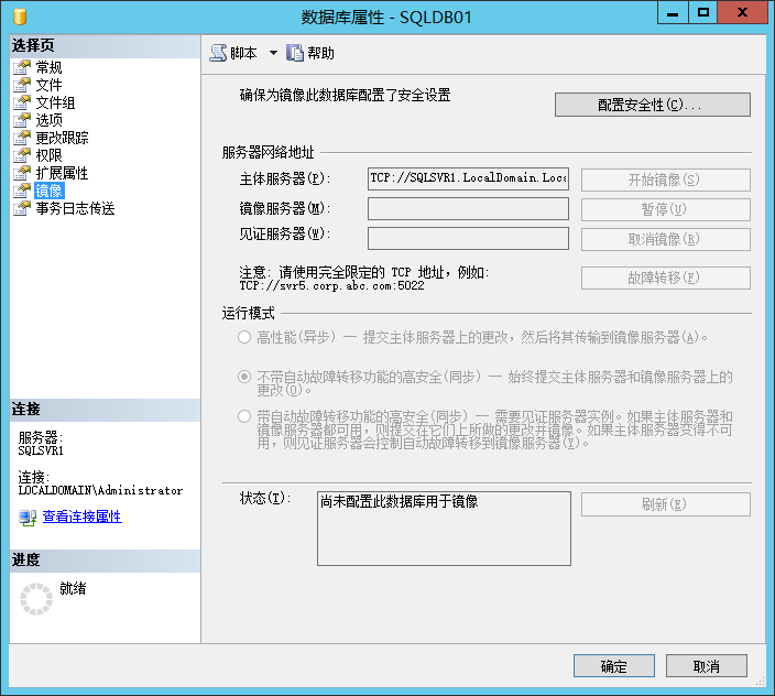 (7)主数据库:镜像的数据库对象不能是系统数据库。主库必须是完整恢复模式。且主从库必须是相同的数据库名。