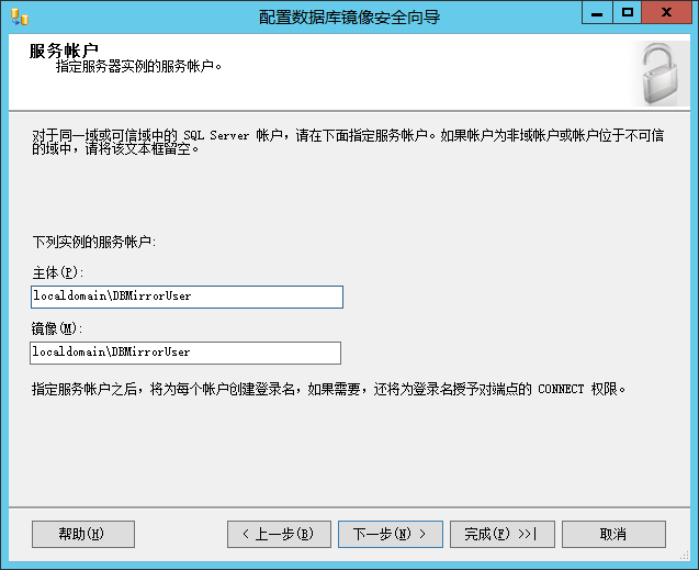 (4.6)服务帐户与端点授权分别为主体和镜像指定一个域帐户。配置向导将为这些帐户创建登录名,并为其授予对端点的 CONNECT 权限。这个登录名只需要 public 固定服务器角色即可
