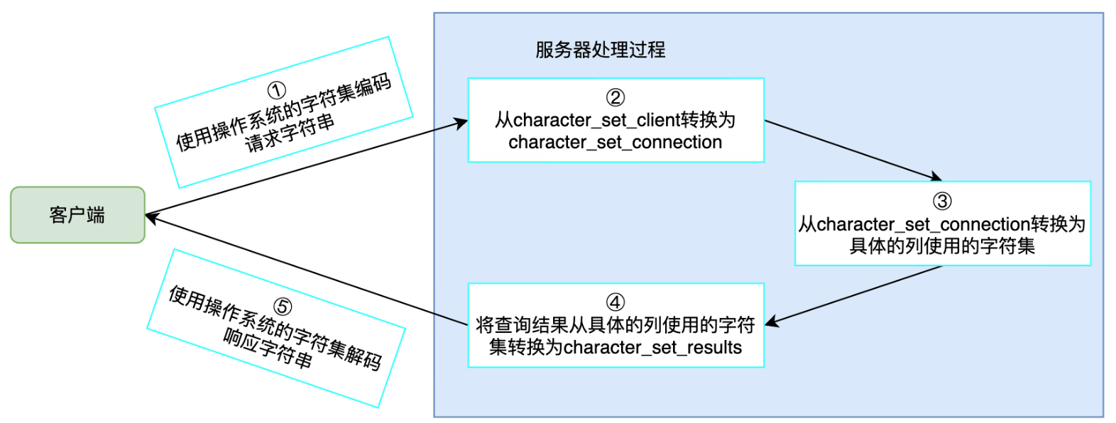 character_set_connection:服务器处理请求时会把请求字符集从 character_set_client 转为 character_set_connection。