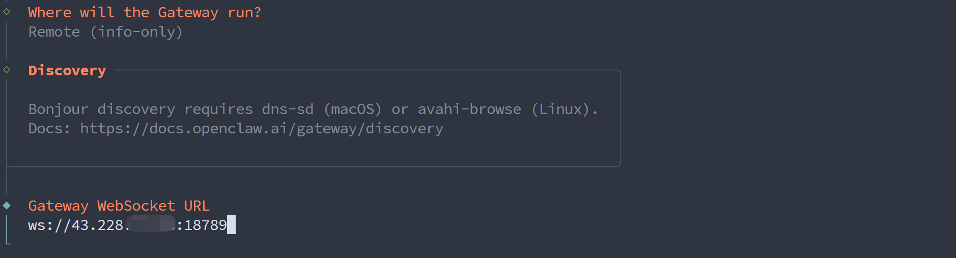 选择 Remote (info-only) 以便能够在外部访问服务器中你的 OpenClaw。