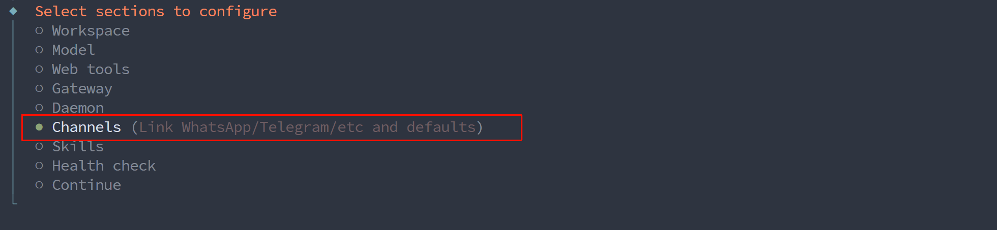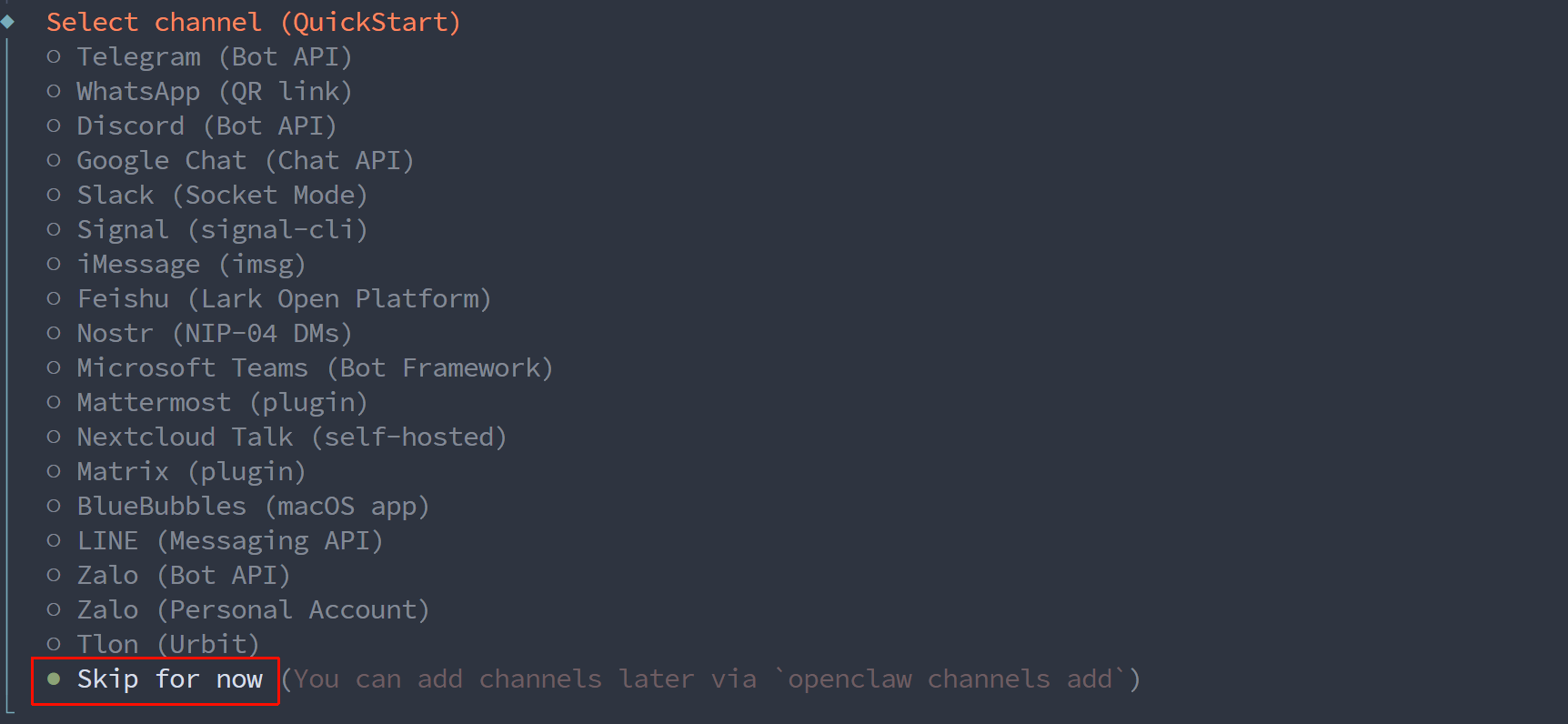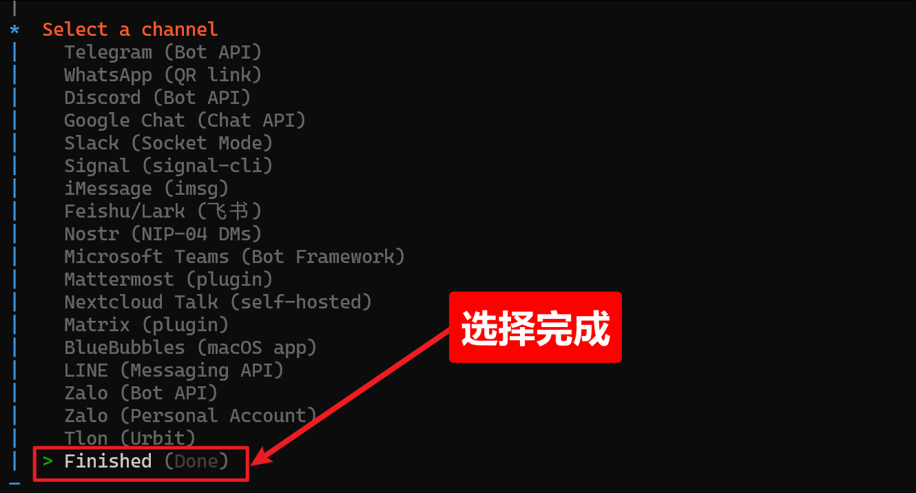 设置你希望通过哪个聊天软件与 OpenClaw 交流,比如 Telegram 或 WhatsApp。向导会引导你完成配对。目前都是一些国外软件,我们先跳过