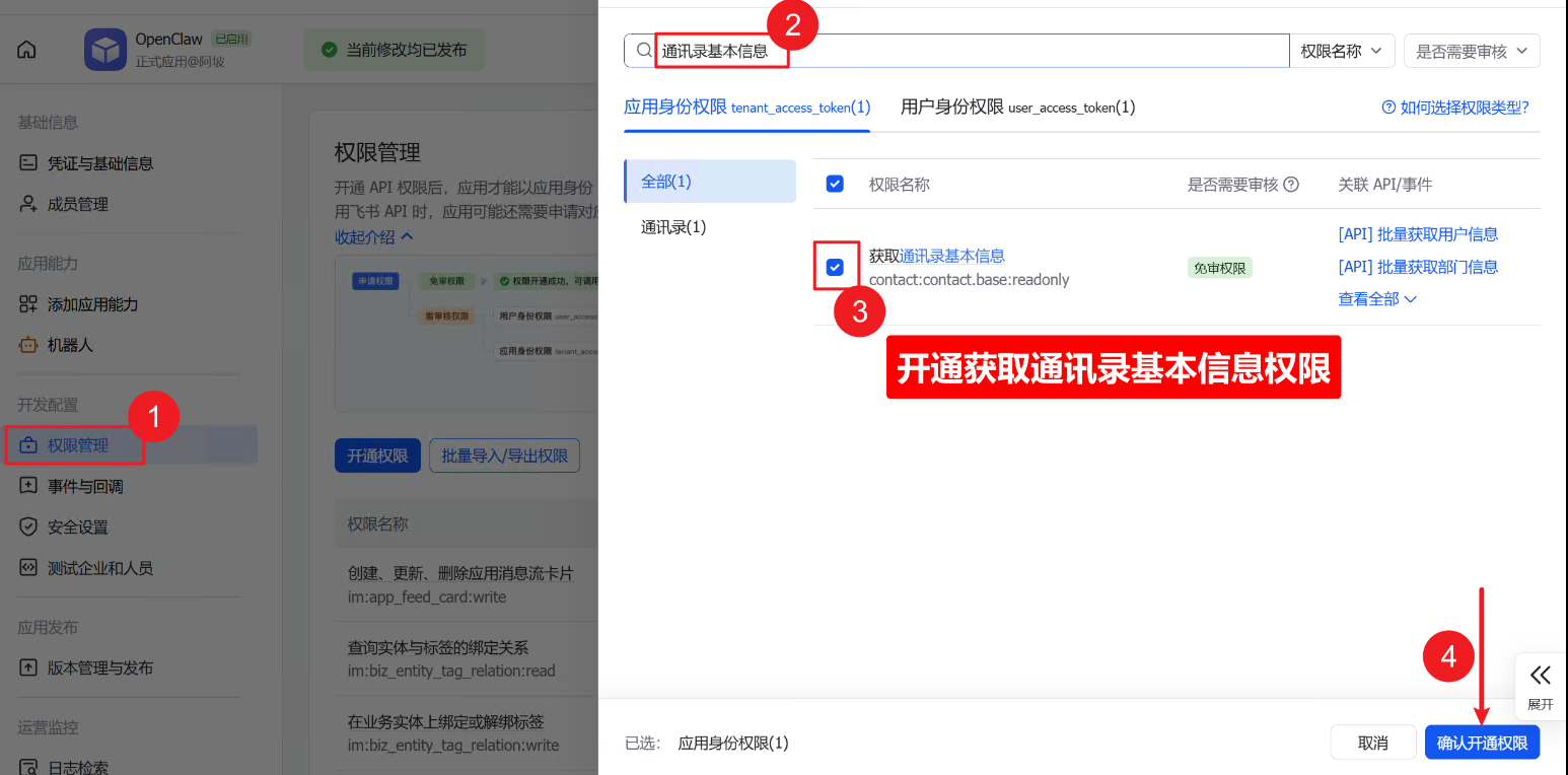 给应用开通获取通讯录基本信息的权限: