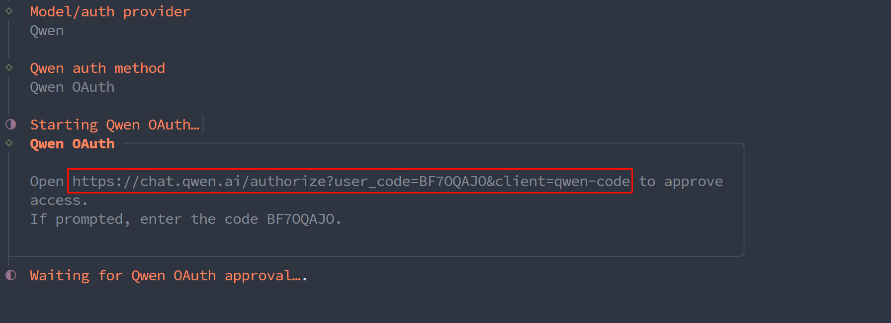 当出现下面链接时,请点击并前往 Qwen 网站进行认证关联: