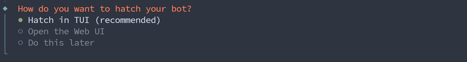 选择 Hatch in TUI,通过终端使用,后面也可以通过配置 Web UI 以便我们可以通过网页访问 OpenClaw。