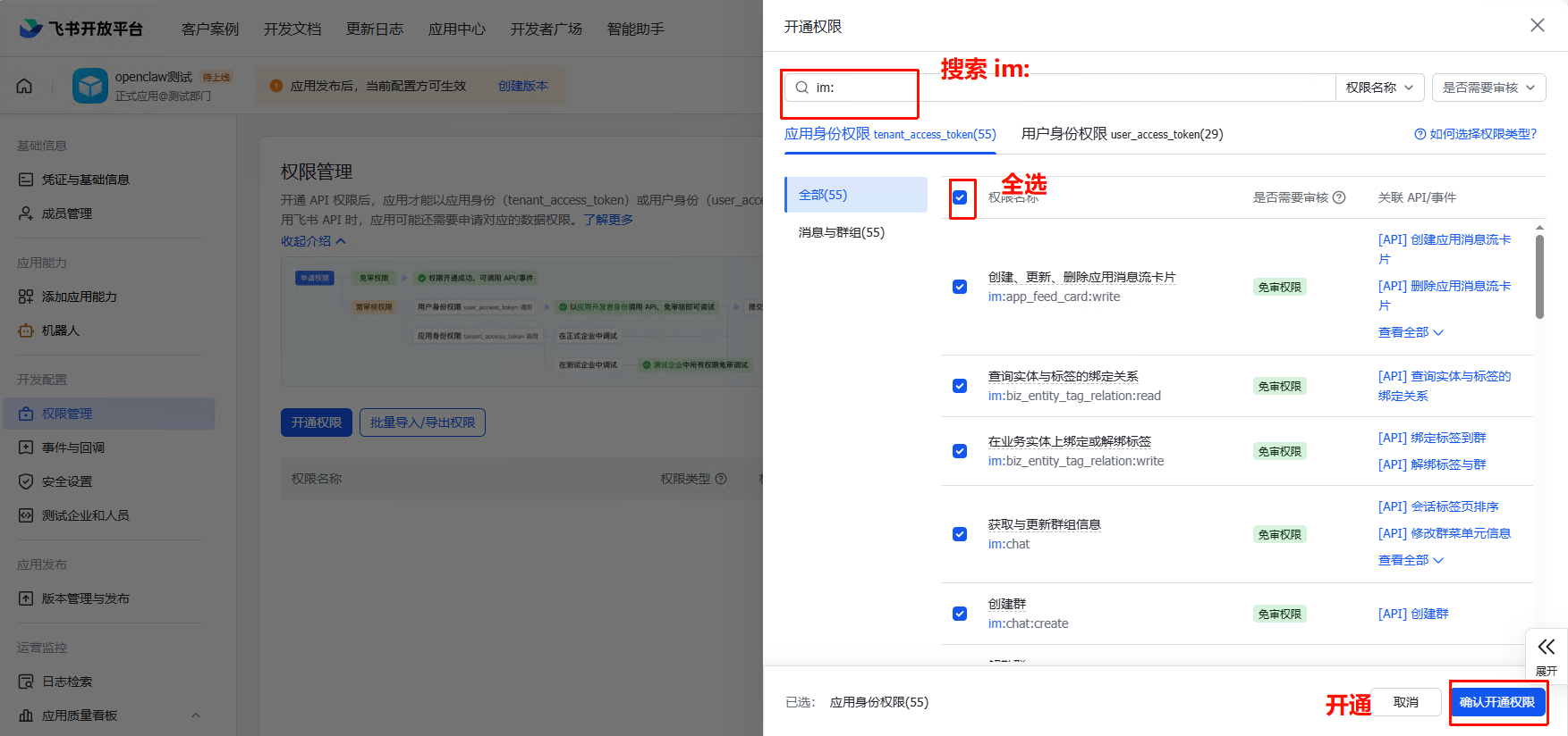 把即时通讯相关的权限全部开通: