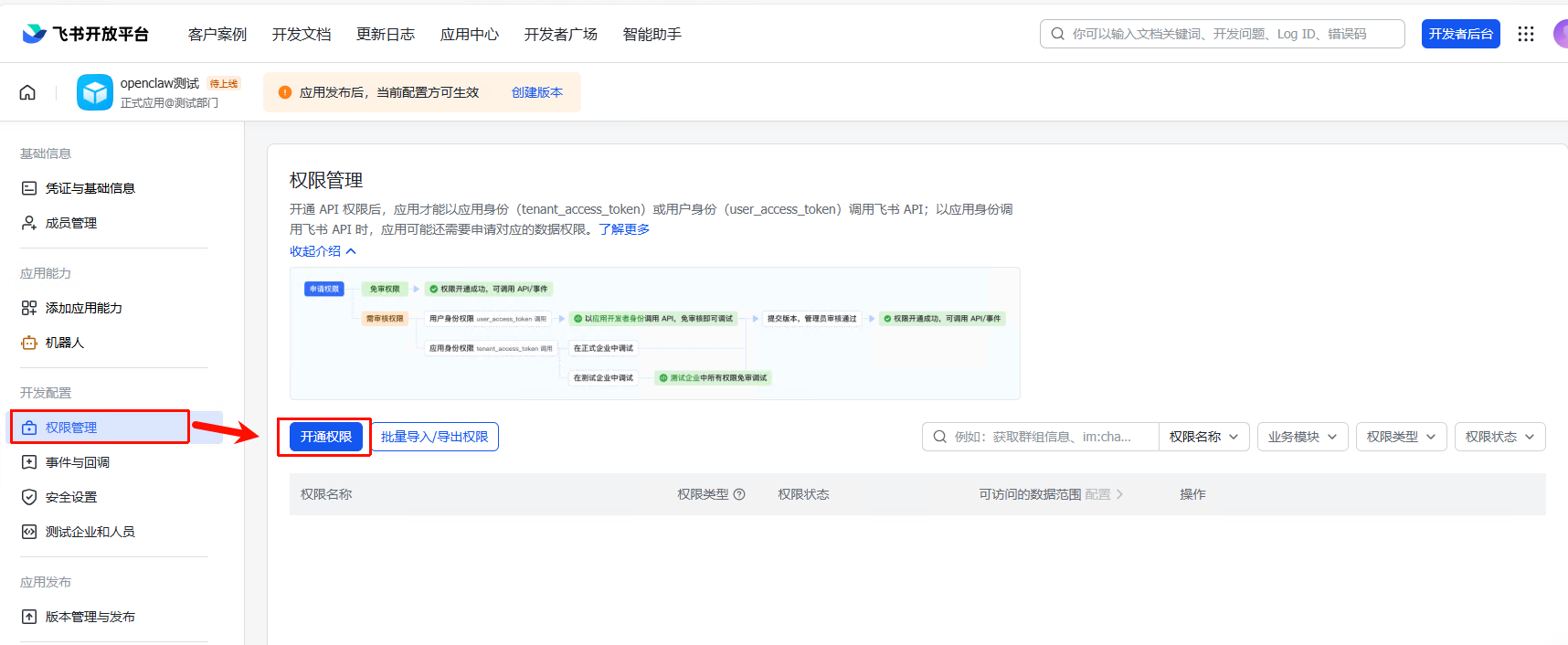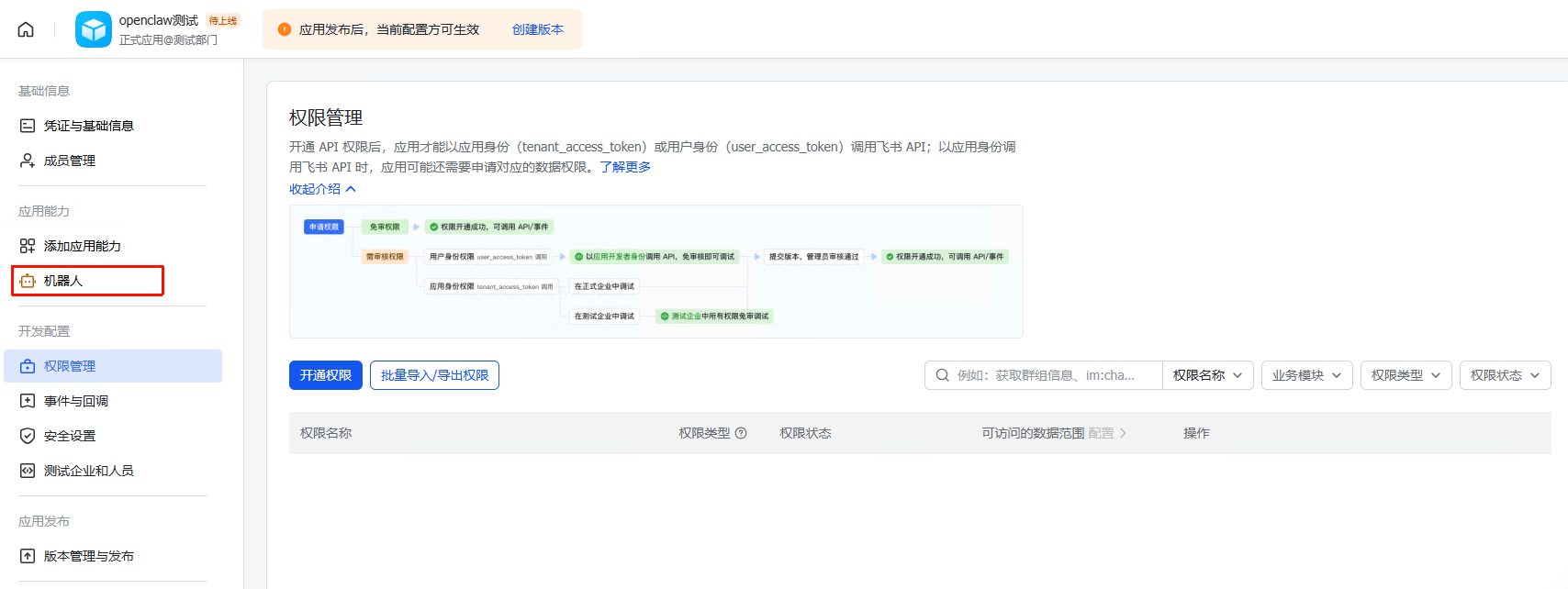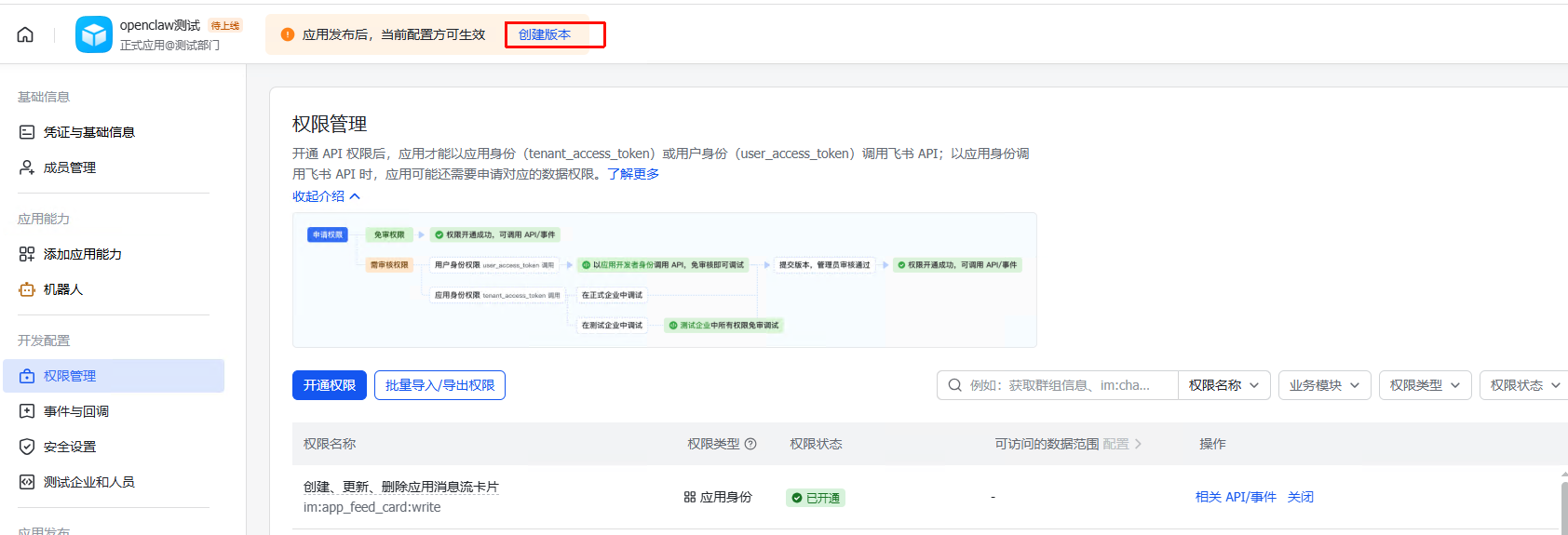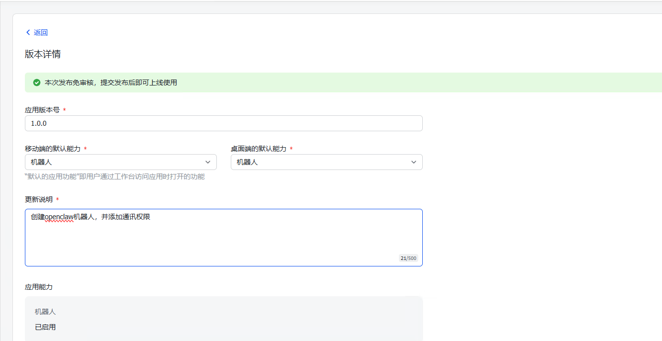 openclaw config set channels.feishu.enabled true4.2.1.4. 创建版本并发布
