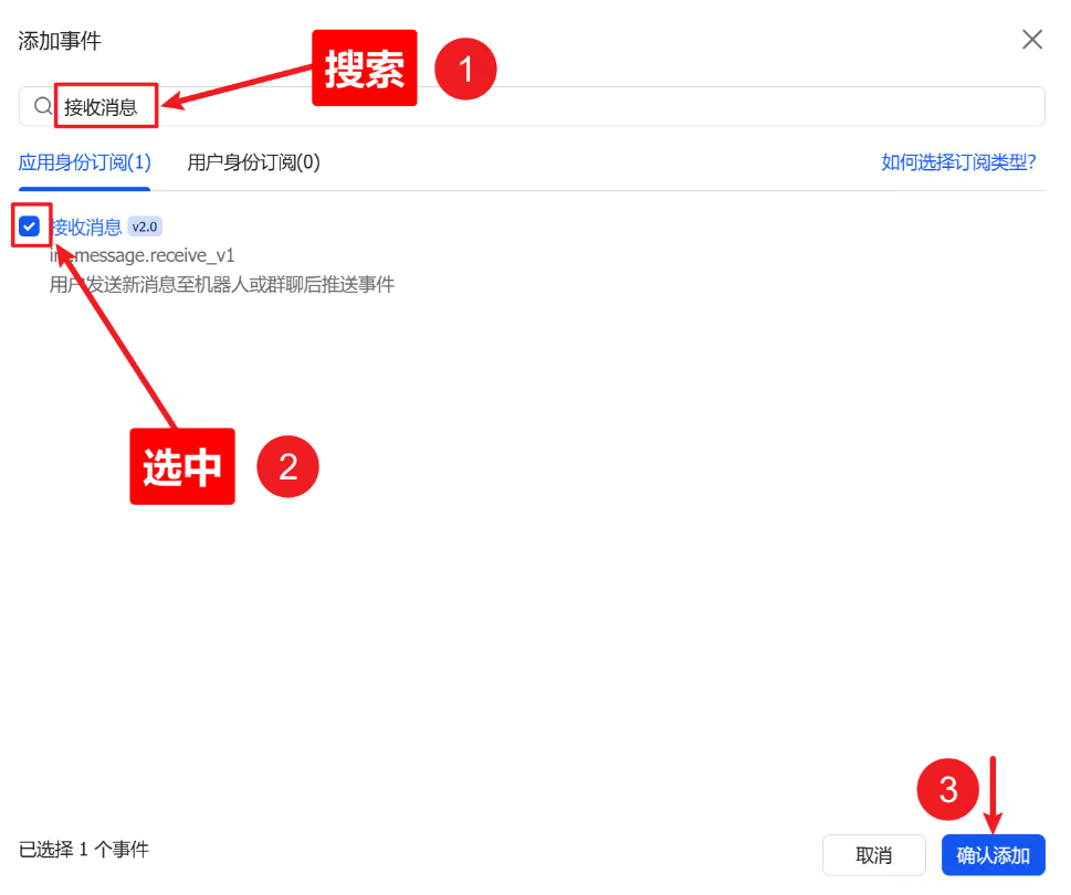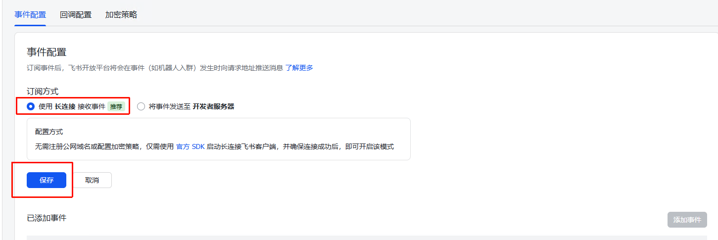 事件配置方式:选择 使用长连接接收事件(推荐)