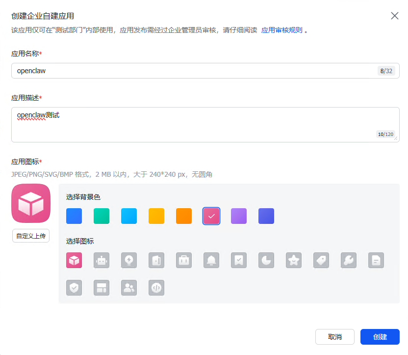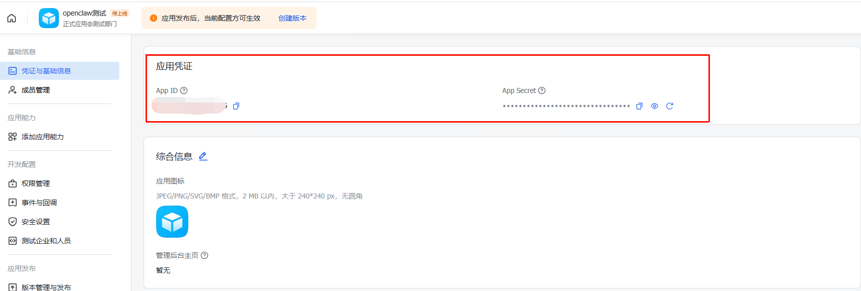 创建后可以查看到应用凭证,后续我们需要用该凭证接入到openclaw