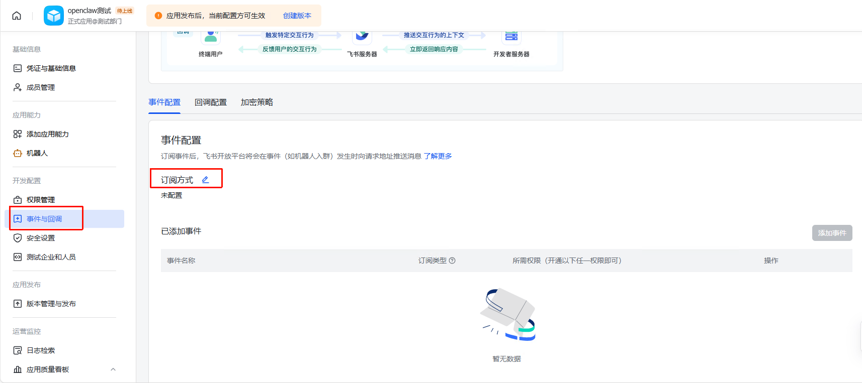 在飞书开放平台的应用后台,进入 事件与回调 页面: