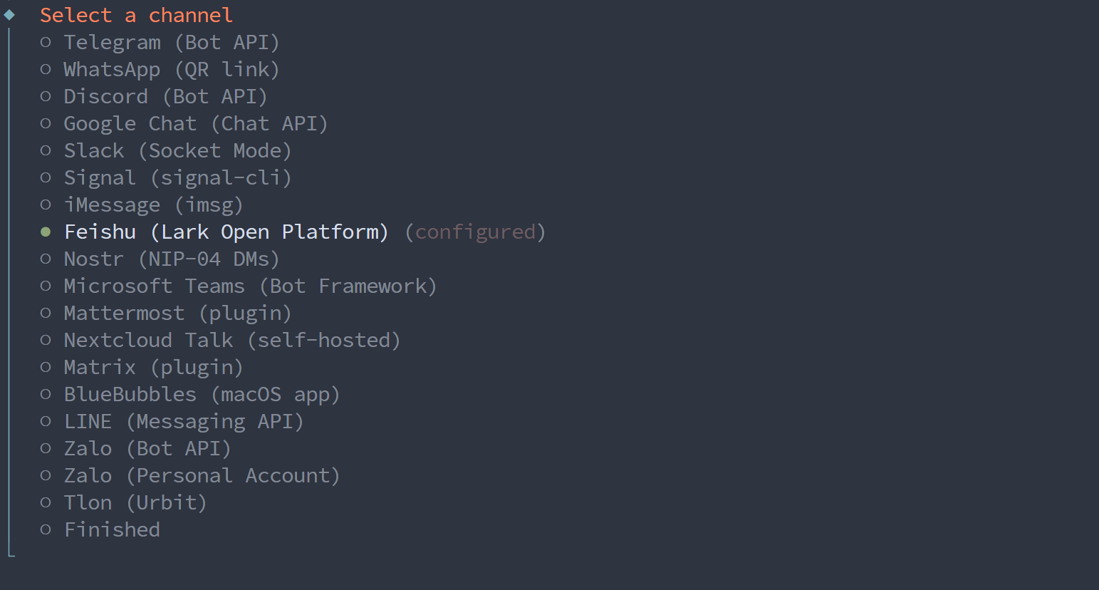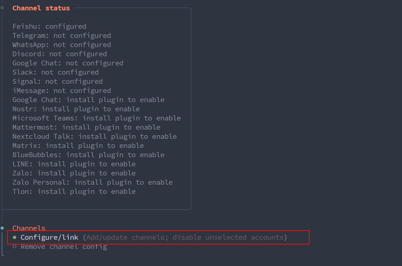 # 可以列出所有已配置的通信渠道及其当前状态。