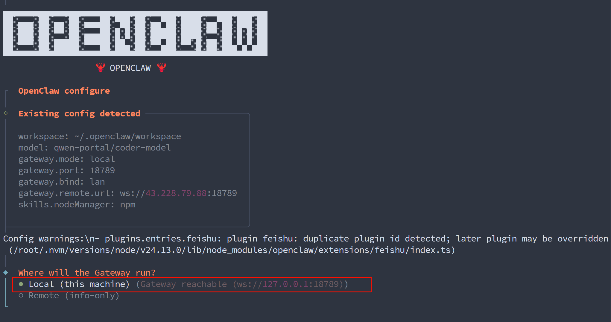 冲突报错: duplicate plugin id detected; later plugin may be overridden (/root/.nvm/versions/node/v24.13.0/lib/node_modules/openclaw/extensions/feishu/index.ts)