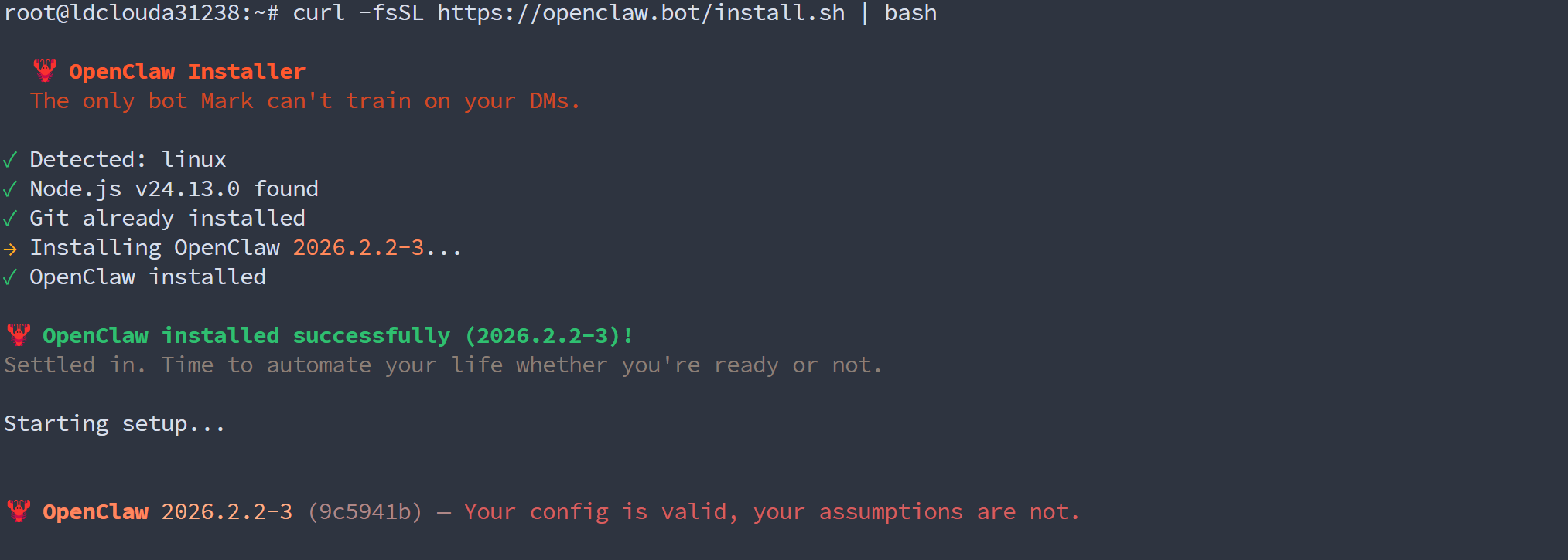这是最简单、最快捷的安装方式。它会自动检测你的操作系统,安装必要的依赖,并将 openclaw 命令部署到全局。