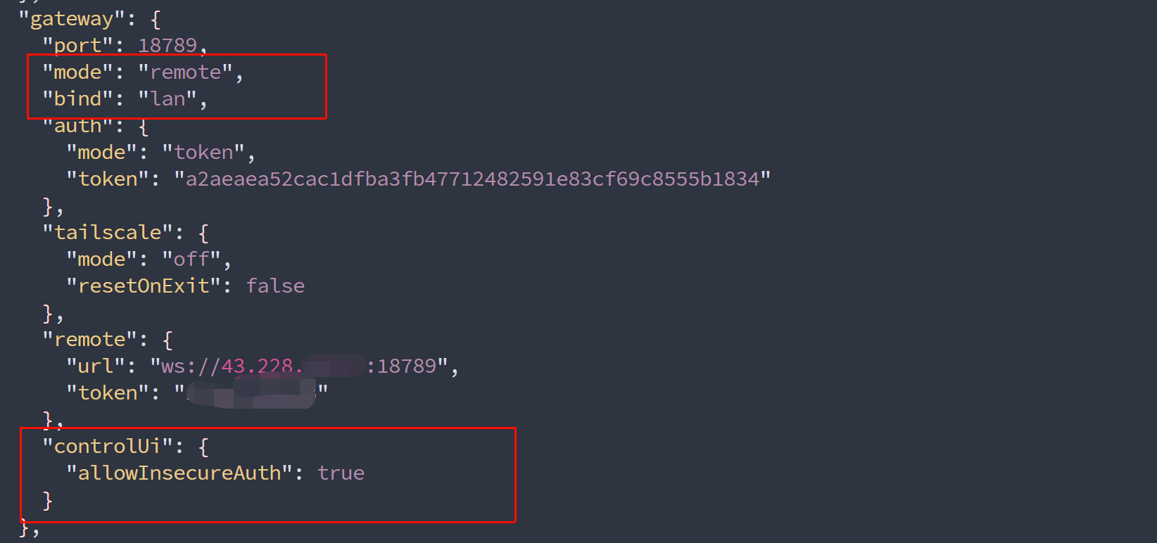openclaw gateway stop将 ~/.openclaw/openclaw.json 里面的 mode 改成 remote,bind 改成 lan,并添加配置