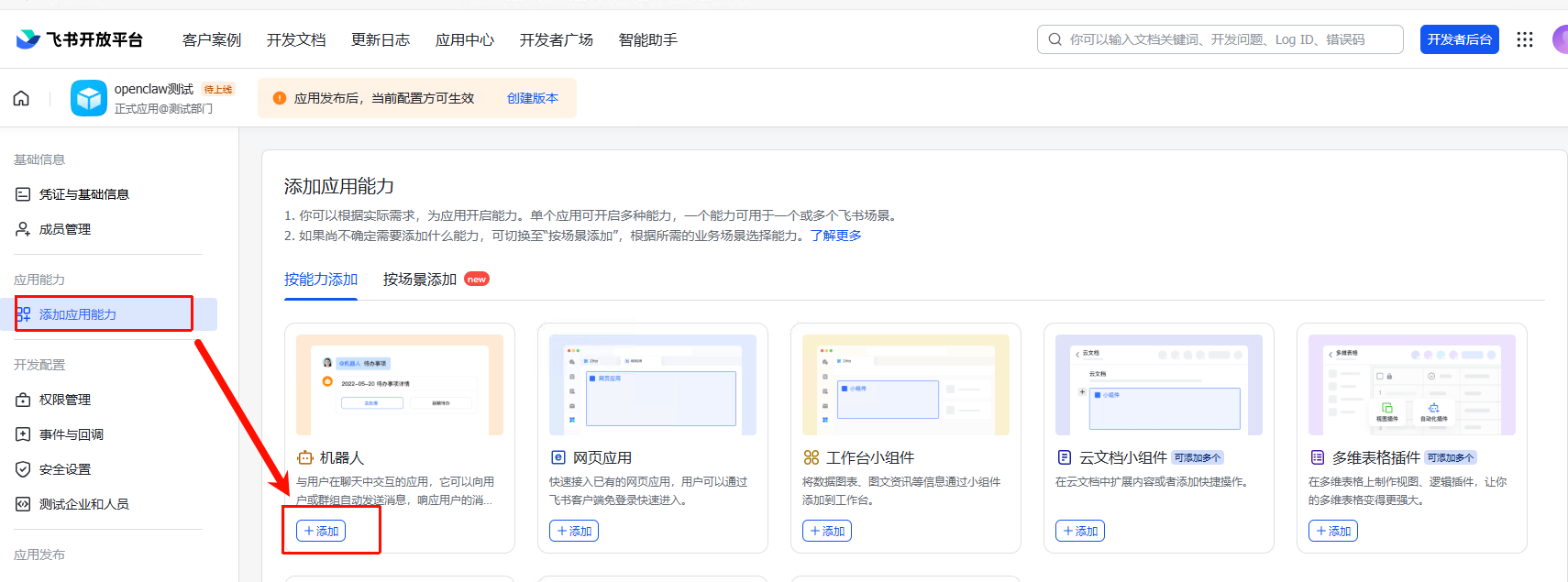 点击【添加应用能力】,并添加机器人
